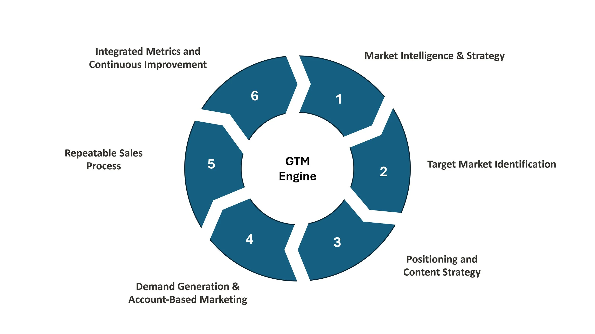 Strategic go-to-market architecture is cyclical and integrated. Market analysis informs positioning, which shapes demand generation, which feeds sales, which generates data that improves strategy.